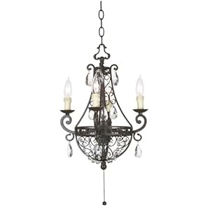 Swag lamps give you a beautiful look without having to have it hardwired. This spicy, swag style mini chandelier comes from the Kathy Ireland Home "Celebracion de la Vida" lighting collection. It comes wired with cord and plug, so all you have to do is just plug into any standard wall outlet for instant style! In a rubbed bronze finish with beaded crystal detail. Four light, candelabra cluster arrangement. On/Off pull chain.