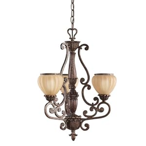 Finish:Berkshire Bronze, Light Bulb:(3)60w B10 Cand F Incand This handsome, three light chandilette is a step back in time to an era of dazzling detail and luxurious accents. With our exclusive new Berkshire Bronze finish, the umber etched marble glass with beaded rim at the top of each shade and the ornate scrollwork throughout, this is a magnificent fixture! Extra lead wire 52' 6' of chain Provided with extra long lead wire to facilitate swag type installations (Swag hooks not included).
