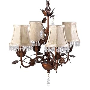mfr: AF Lighting Rachel Mini Chandelier Olde Bronze with clear drop crystal trim and accents and white pearl shades 17" x 22" 4-40W Candle Base