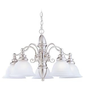 The Five-Light Chandelier from Sea Gull Lighting's Canterbury Collection is Shapely and Ready to light up a Room! The Five-Light Chandelier features a Brushed Nickel Finish with Satin Etched Glass. Includes 12-Feet of Wire Pre-Laced Through 10-Feet of Chain.