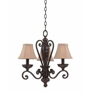 Finish: Harvest Bronze, Light Bulb: (3)60w B10 Cand F Incand Jewelry 3-Light Mini Chandelier. Mosaic Glass accents. Fabric shades. Includes 6 feet of chain and 12 feet of cord.